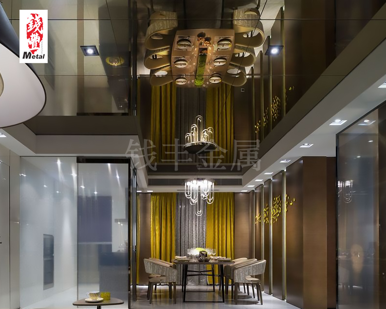 不锈钢镜面蜂窝板的最大亮点在于其独特的外观,不仅拥有镜面效果,还有钢的强度,营造出明亮开阔的空间氛围,拥有提高层高,扩大空间的装饰效果,非常适合用于餐厅,服装店,商场,电梯包厢等天花吊顶以及墙面装饰。不仅如此,它具有独特的金属质感,让室内的吊顶更加高级大气,令人眼前一亮。