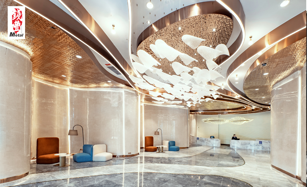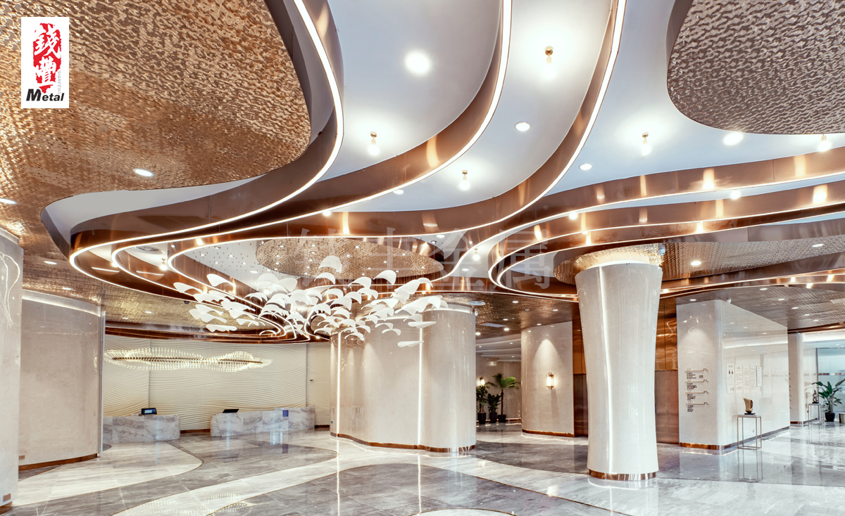 总的来说,不锈钢水波纹板在高档会所的天花板吊顶上的应用,能够带来艺术感和现代感,展现出豪华和精致的氛围,同时还具备耐用和易清洁等优点,为会所空间增添独特的视觉效果。